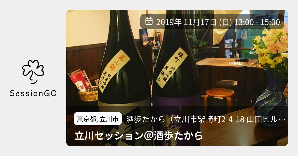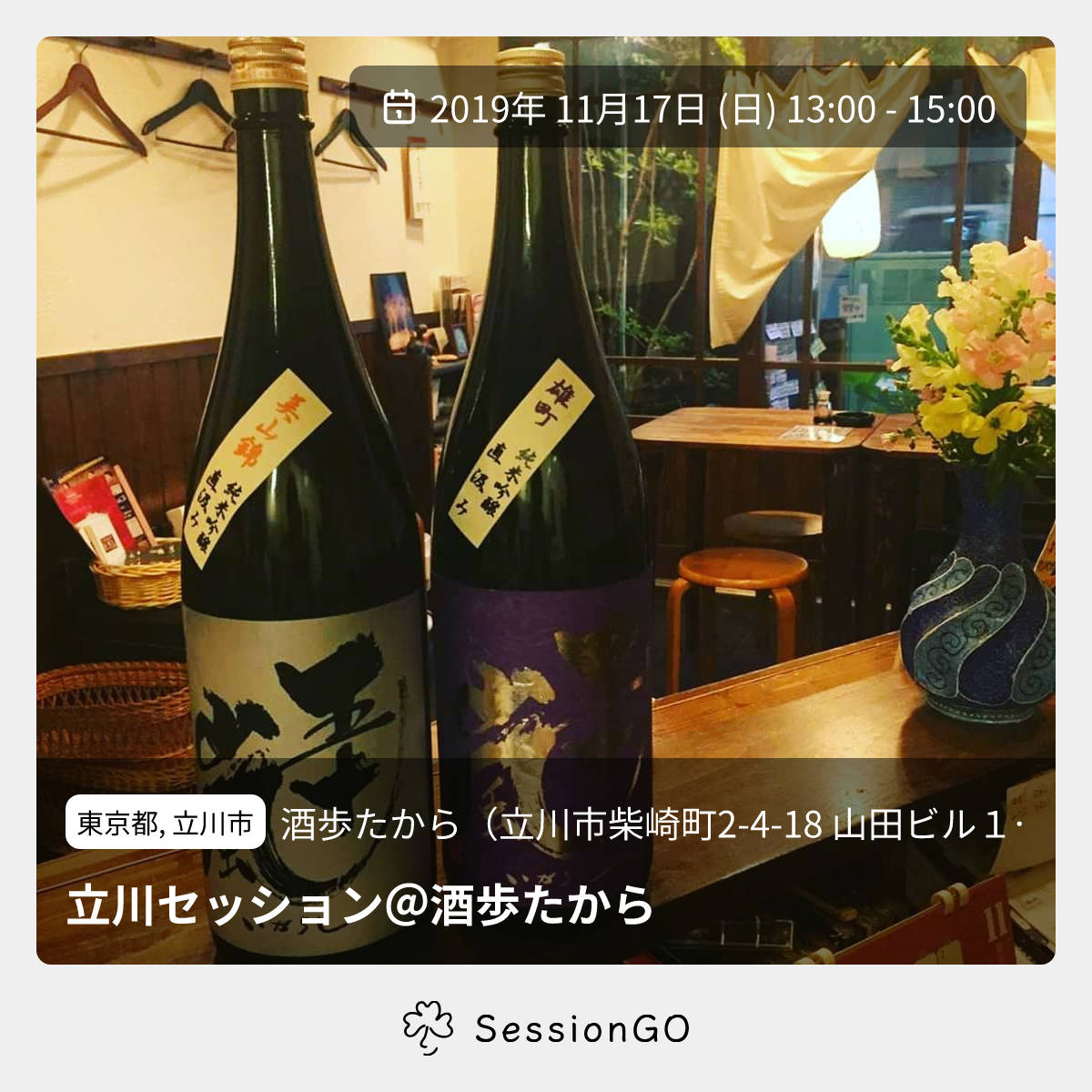 東京都, 立川市酒歩たから(立川市柴崎町2-4-18 山田ビル1F)立川セッション@酒歩たから 2019年11月17日(日)終了4:00 - 6:00東京都立川市柴崎町2丁目4−17主催者:Akie Igarashi🔰 初心者歓迎日曜日の午後、立川駅南口の居心地抜群の隠れ家居酒屋でゆる~くセッションしませんか?アコーディオン・マエストロ2名のスペシャルゲストも予定しています! 初心者、ご見学、お子さま連れ大歓迎!要ドリンクオーダーです。セッション時間中はドリンクのみですが、16時からのAlan Patton(Acc)のライブではお食事も楽しめます! https://www.facebook.com/酒歩たから-495793077106633/イベント内容をコピーして新規投稿※閉店・移転などにより、正常に表示されない場合があります