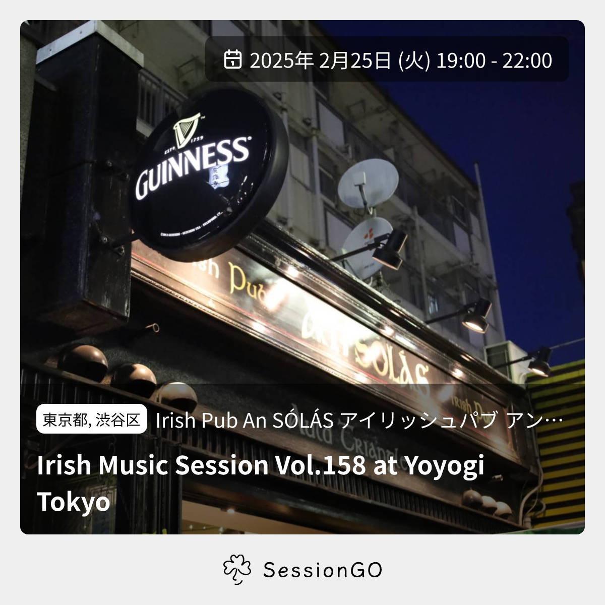 東京都, 渋谷区Irish Pub An SÓLÁS アイリッシュパブ アン ソラスIrish Music Session Vol.158 at Yoyogi Tokyo2025年2月25日(火)終了10:00 - 13:00東京都渋谷区千駄ケ谷5丁目22−3 都営千駄ヶ谷アパート 1号館 103号主催者:Hiroshi Hasegawa🔰 初心者歓迎🚭 開催場所が禁煙代々木のアイリッシュパブ「An SÓLÁS(アンソラス)」のセッションのご案内です。皆様の参加・ご来店を心よりお待ちしておりますイベント内容をコピーして新規投稿※閉店・移転などにより、正常に表示されない場合があります