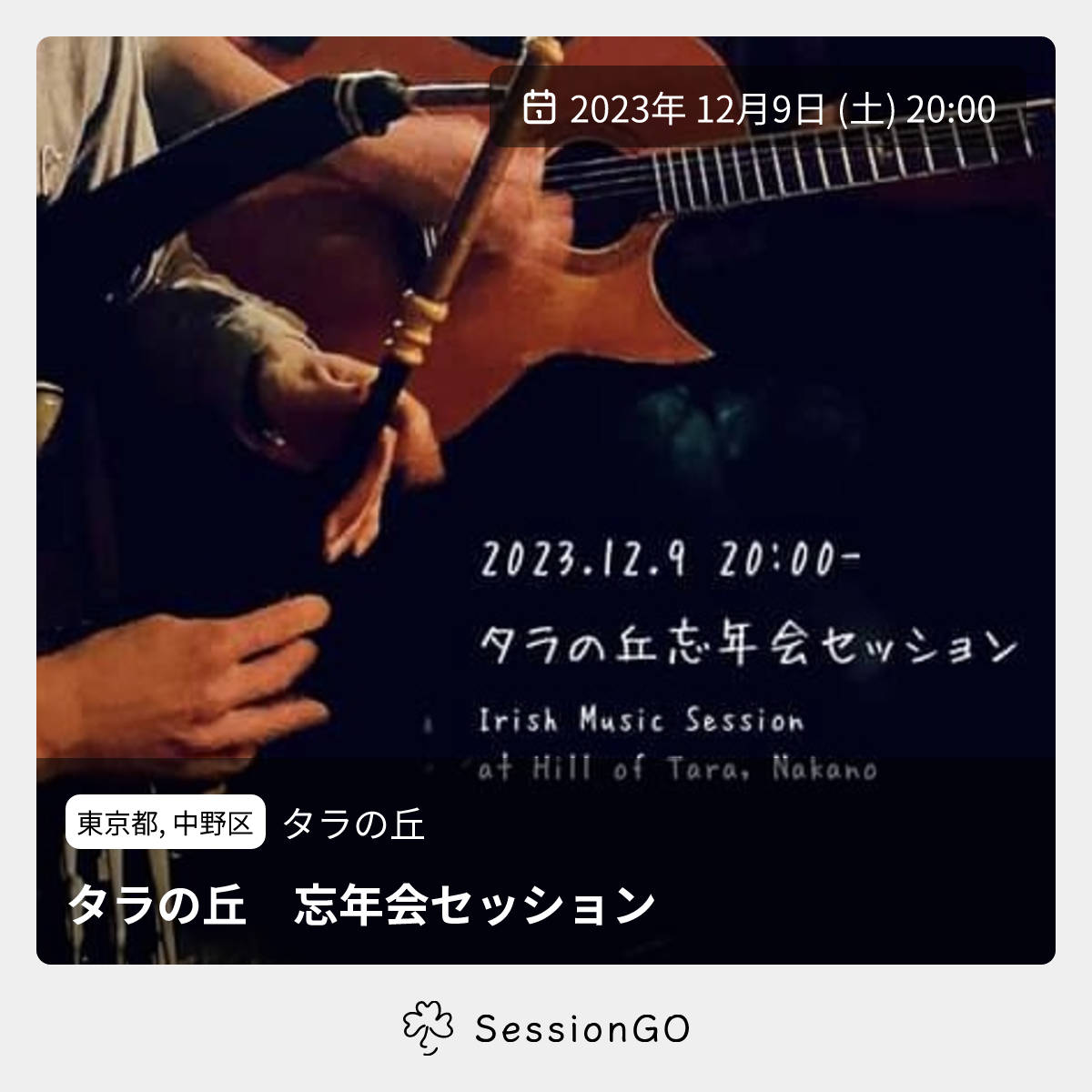 東京都, 中野区タラの丘タラの丘 忘年会セッション2023年12月9日(土)終了11:00東京都中野区中野5丁目53主催者:内野貴文(イリアンパイプス)、下田理(ギター)🔰 初心者歓迎タラの丘は中野の小さなアイリッシュバーです。 今年も1年お疲れ様でした。という感じでのんびり飲みながら弾きましょう。 弾く方も飲むだけの方も歓迎! タラの丘初めての方も歓迎です。 席数少なめですので、立ち飲み立ち弾きになることもございますがご了承ください。イベント内容をコピーして新規投稿※閉店・移転などにより、正常に表示されない場合があります