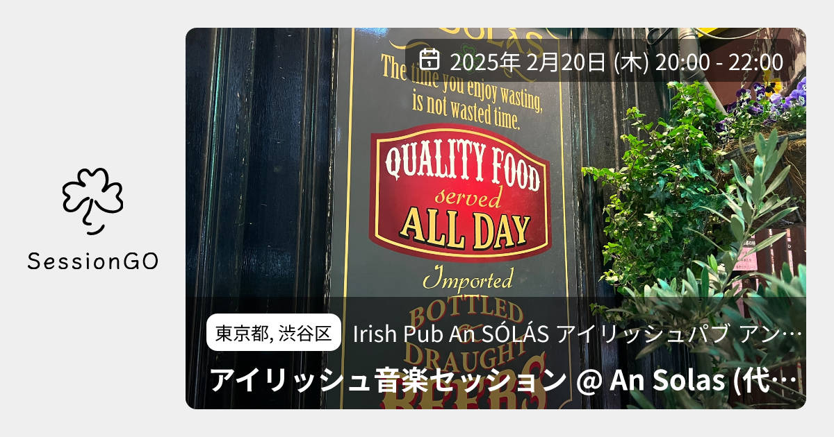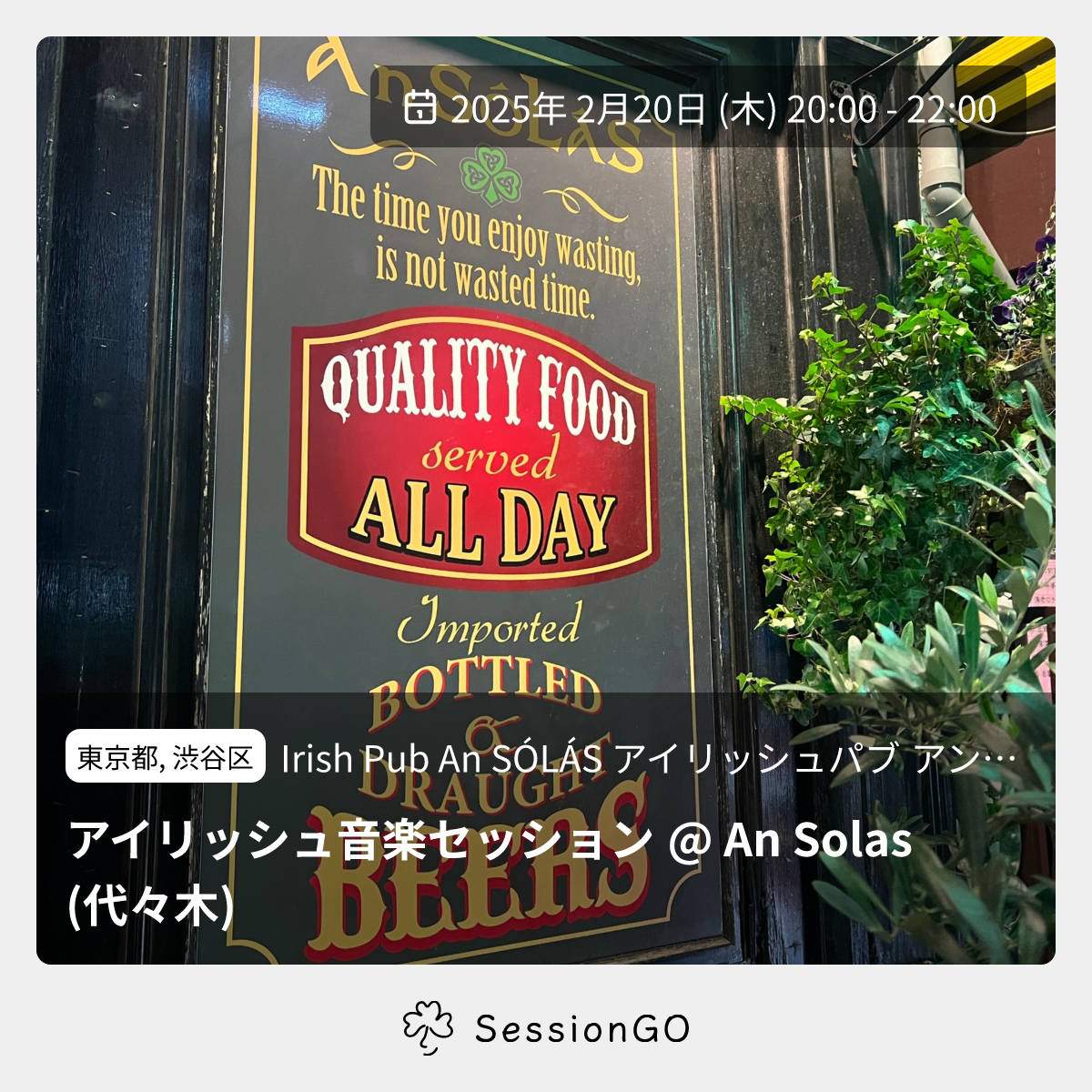 東京都, 渋谷区Irish Pub An SÓLÁS アイリッシュパブ アン ソラスアイリッシュ音楽セッション @ An Solas (代々木)2025年2月20日(木)終了11:00 - 13:00東京都渋谷区千駄ケ谷5丁目22−3 都営千駄ヶ谷アパート 1号館 103号主催者:LIM🔰 初心者歓迎2025年2月20日(木曜日)、代々木のアンソラスでセッションがあります。 自由参加のオープンセッションです。 日時: 2025年2月20日(木曜日) 20時~22時 場所: Irish Pub An SÓLÁS (アイリッシュパブ アン ソラス) 住所: 〒151-0051 東京都渋谷区千駄ヶ谷5丁目22−3 都営住宅千駄ヶ谷アパート1号館103号 ℡: 03-5919-6686 イベント内容をコピーして新規投稿※閉店・移転などにより、正常に表示されない場合があります