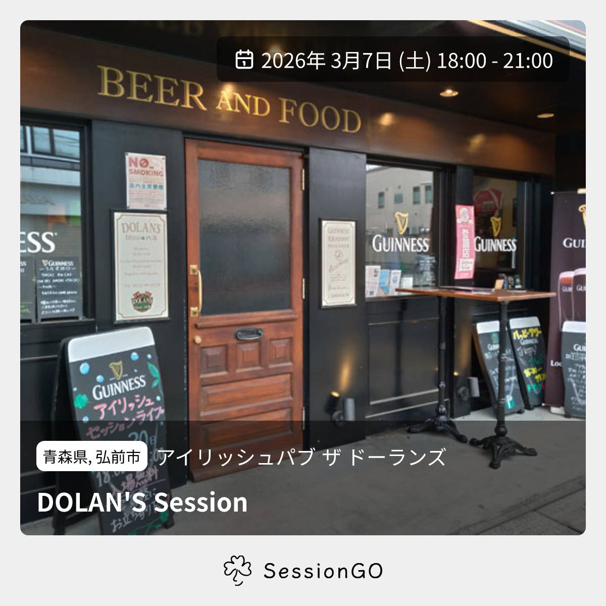 青森県, 弘前市アイリッシュパブ ザ ドーランズDOLAN'S Session2026年3月7日(土)9:00 - 12:00青森県弘前市代官町2主催者:TRAD🚭 開催場所が禁煙🙋♀️ 事前申し込みが必要北東北唯一の定期Session! アイリッシュやケープブレトンを中心に弾いています。ホストはfiddleとpianoの夫婦です。 大雪の場合、中止になる可能性があります。ご理解いただけますと幸いです。 演奏者席をご準備下さるので、ご参加の方は事前に「irish_trad(アットマーク)hotmail.co.jp」までご連絡ください。 会場となるDOLAN'Sさんはアイルランドのパブで勤務経験がある店主さんがいる、居心地がよくてお料理がおいしい素敵なパブです。Session共々お楽しみ頂けたら嬉しいです。お待ちしております。イベント内容をコピーして新規投稿※閉店・移転などにより、正常に表示されない場合があります