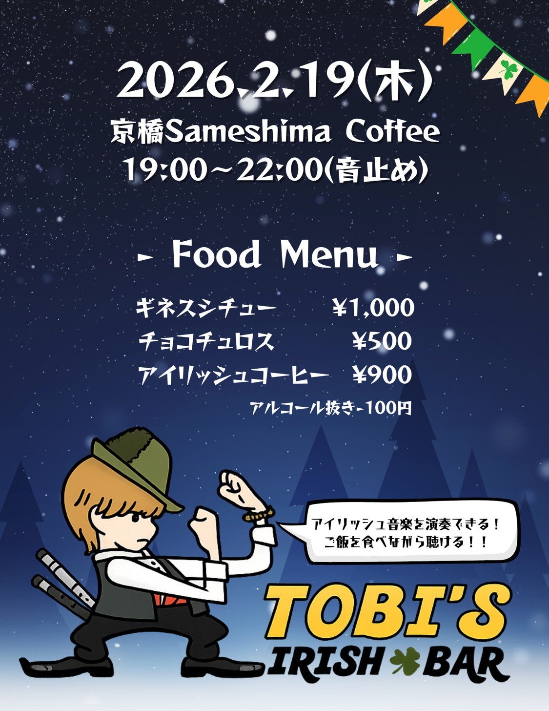 もちろん聴きにいくだけ、ご飯を食べるだけでも大歓迎です❗️ギネスシチュー🍛などアイリッシュな特別メニューをいただきながら音楽を楽しんでいただけます😁