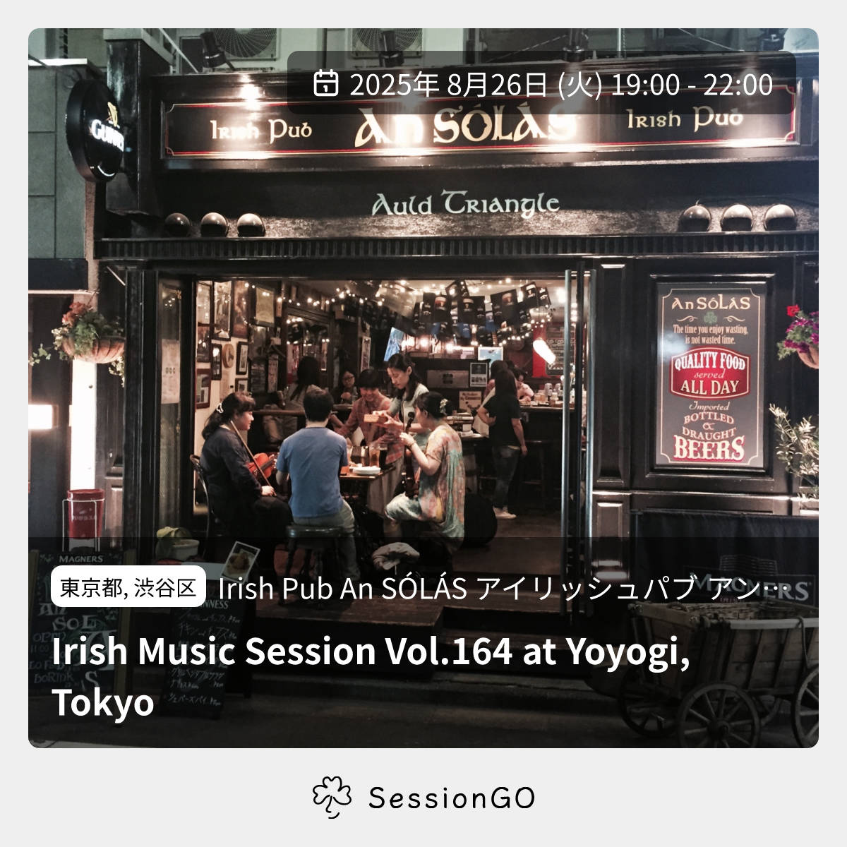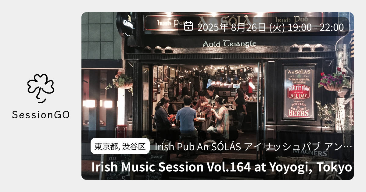 東京都, 渋谷区Irish Pub An SÓLÁS アイリッシュパブ アン ソラスIrish Music Session Vol.164 at Yoyogi, Tokyo2025年8月26日(火)終了10:00 - 13:00東京都渋谷区千駄ケ谷5丁目22−3 都営千駄ヶ谷アパート 1号館 103号主催者:Hiroshi Hasegawa🔰 初心者歓迎🚭 開催場所が禁煙代々木のアイリッシュパブ「An SÓLÁS(アンソラス)」のセッションのご案内です。皆様の参加・ご来店を心よりお待ちしております。イベント内容をコピーして新規投稿※閉店・移転などにより、正常に表示されない場合があります