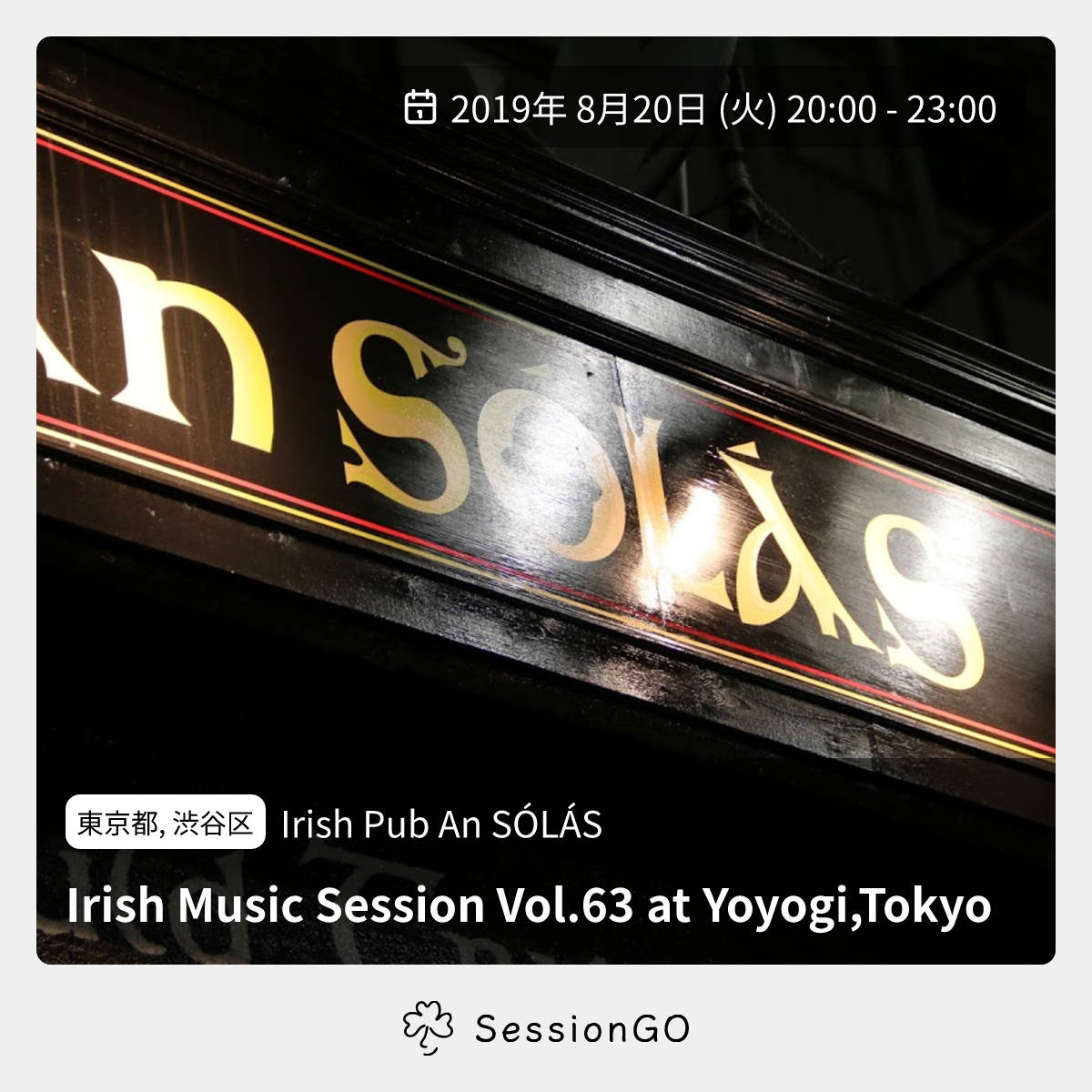 東京都, 渋谷区Irish Pub An SÓLÁSIrish Music Session Vol.63 at Yoyogi,Tokyo2019年8月20日(火)終了11:00 - 14:00東京都渋谷区千駄ケ谷5丁目22−3主催者:Hasegawa Hiroshi🔰 初心者歓迎代々木のアイリッシュパブ「An SÓLÁS(アンソラス)のアイルランド音楽のセッション(チャージフリー)のご案内です。 皆様の参加・ご来店を心よりお待ちしております。イベント内容をコピーして新規投稿※閉店・移転などにより、正常に表示されない場合があります