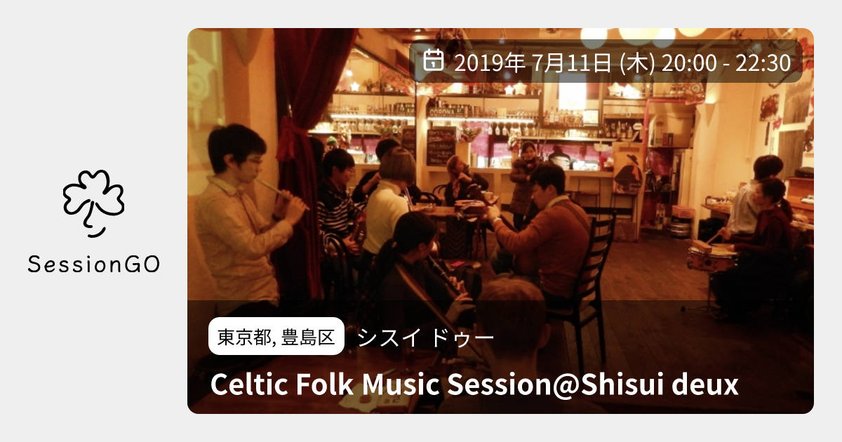 東京都, 豊島区シスイ ドゥーCeltic Folk Music Session@Shisui deux2019年7月11日(木)終了11:00 - 13:30東京都豊島区南大塚1丁目60−20主催者:Ryza🔰 初心者歓迎Celtic Folk Music Session @大塚シスイドゥー 日時:7月11日(木) 20時から~ 場所:Shisui deux (大塚駅から徒歩2分。池袋駅からJR山手線で一駅です。) http://shisuideuxotk.wixsite.com/shisui-deux-hp-wix 「大塚ケルティックプロジェクト2019」 アイリッシュとスコティッシュが中心のセッションです。 うた歓迎! たまには他のヨーロッパ地域のトラッドもOKです。 ワインもギネスもお酒各種そろってます。イベント内容をコピーして新規投稿※閉店・移転などにより、正常に表示されない場合があります