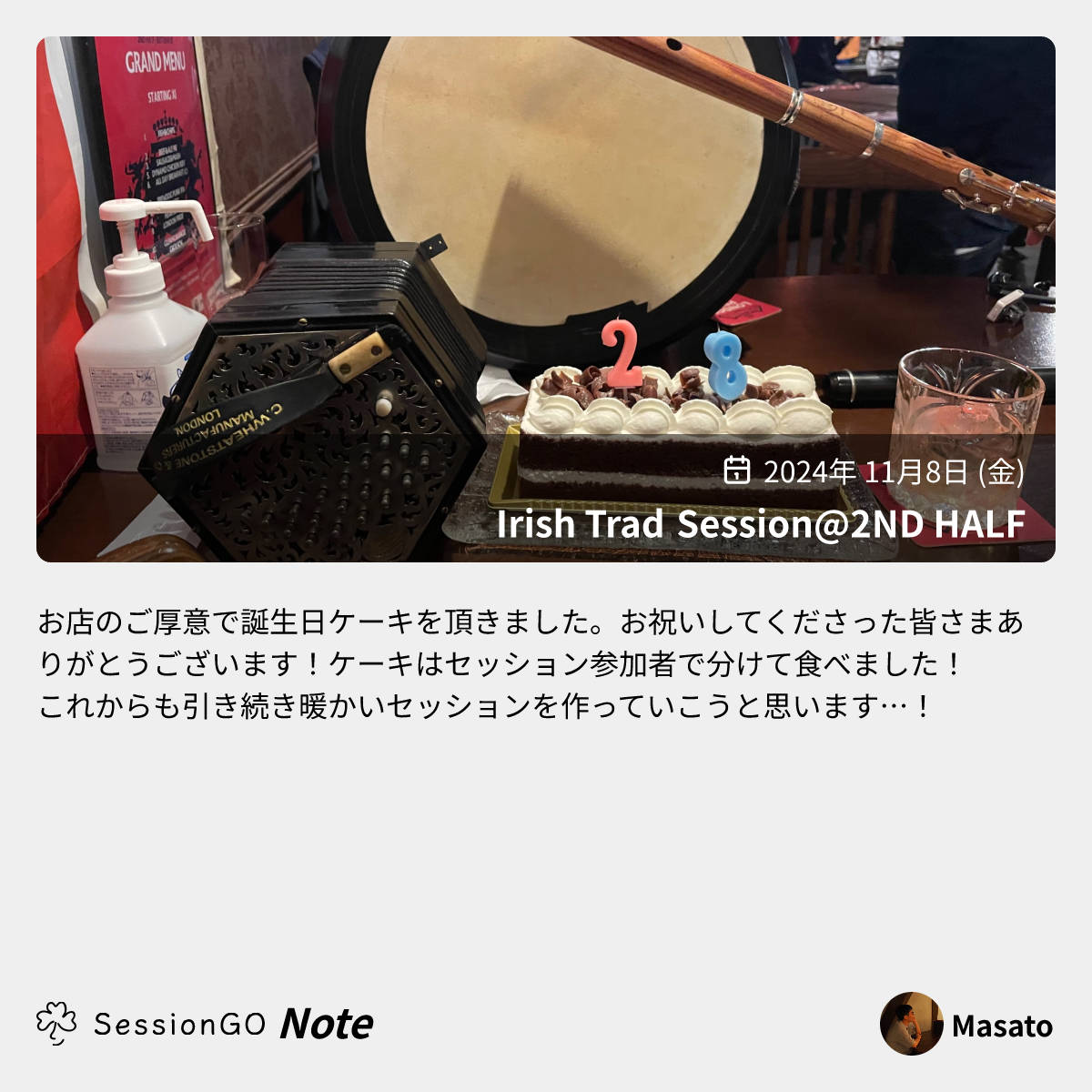 お店のご厚意で誕生日ケーキを頂きました。お祝いしてくださった皆さまありがとうございます!ケーキはセッション参加者で分けて食べました!